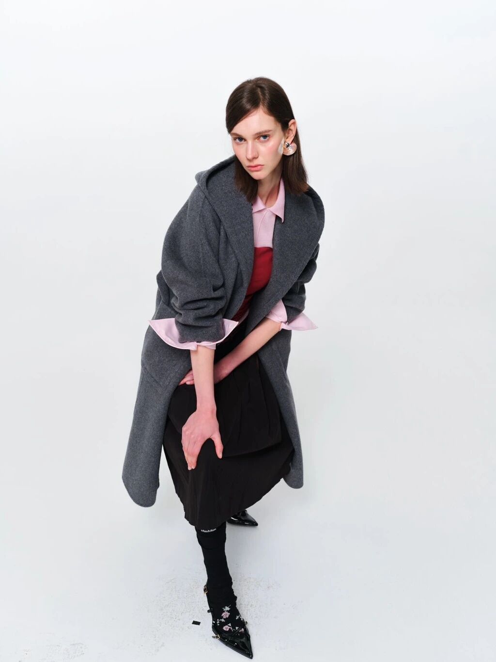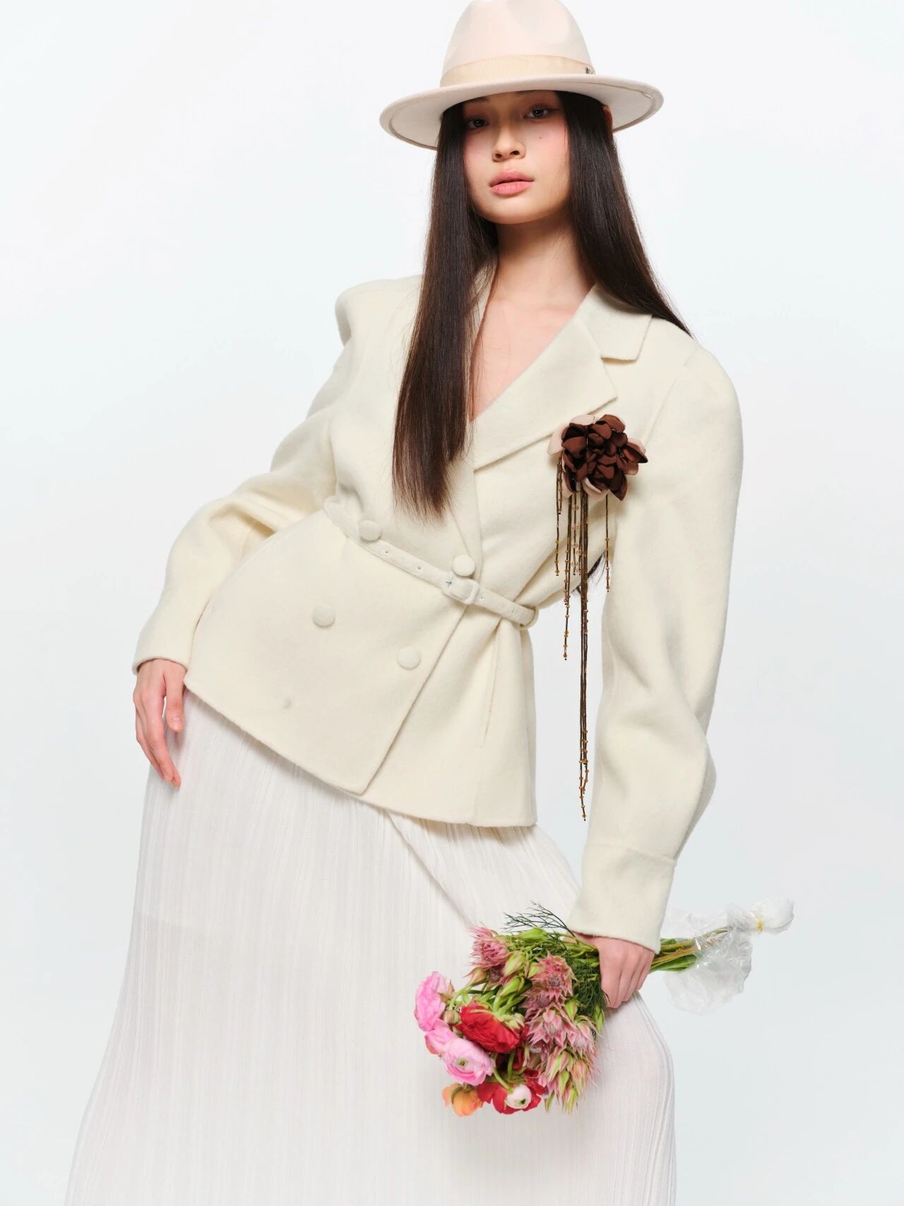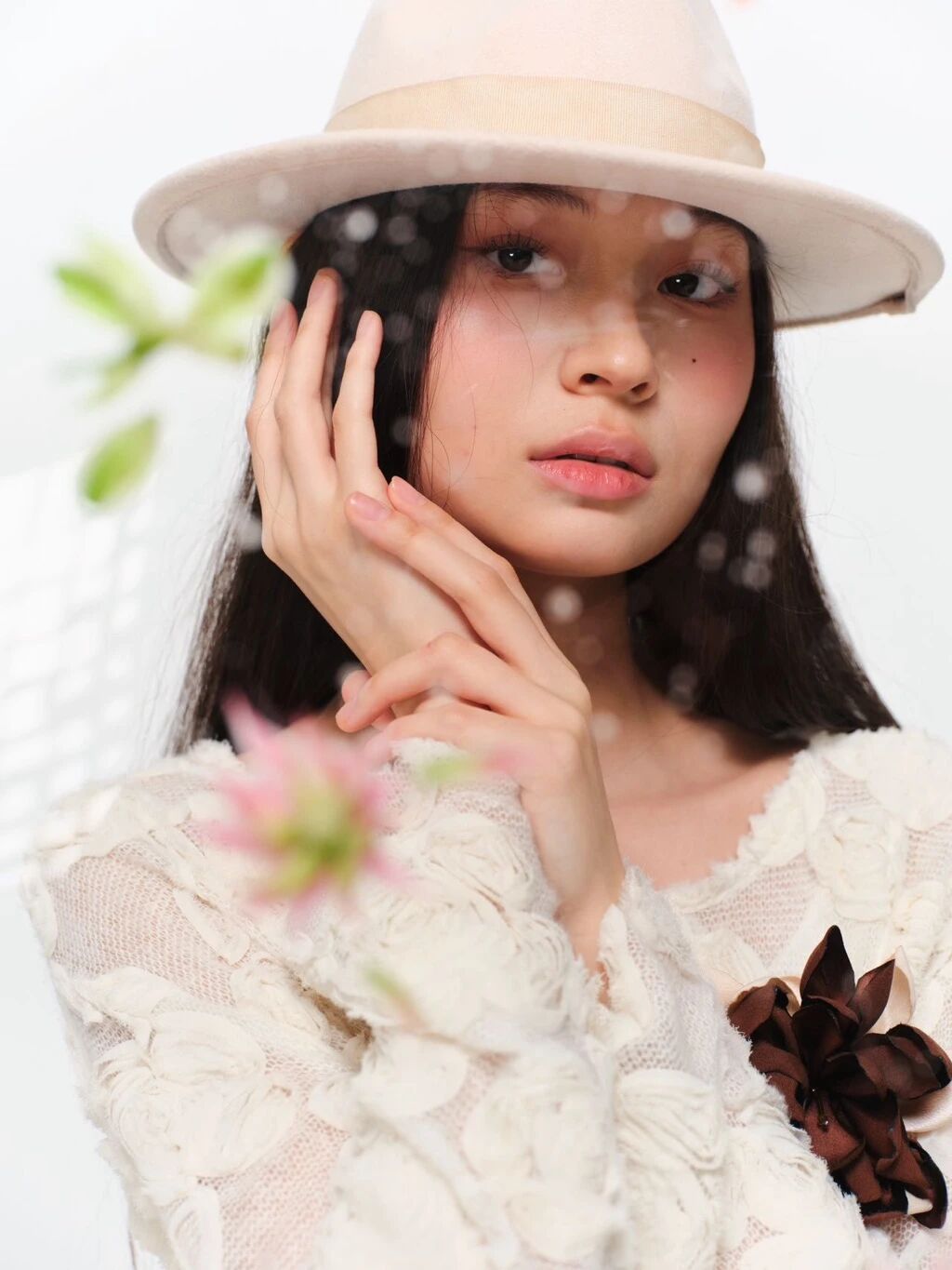 各式立体花朵经由手工缝制点缀衣间,层层叠叠的精致工艺,让平面印花与立体花材相互映衬。系列配饰以多层立体布艺花为核心,花瓣采用深棕与米金双色撞色,边缘做旧烧边处理,呈现复古做旧质感,层次丰富且富有肌理感。花心处点缀古铜色金属圆珠,增添精致重工感;下方垂坠多条古铜色金属细链,链身串入透明水晶珠与细珠,随动作摇曳灵动,拉长视觉线条。